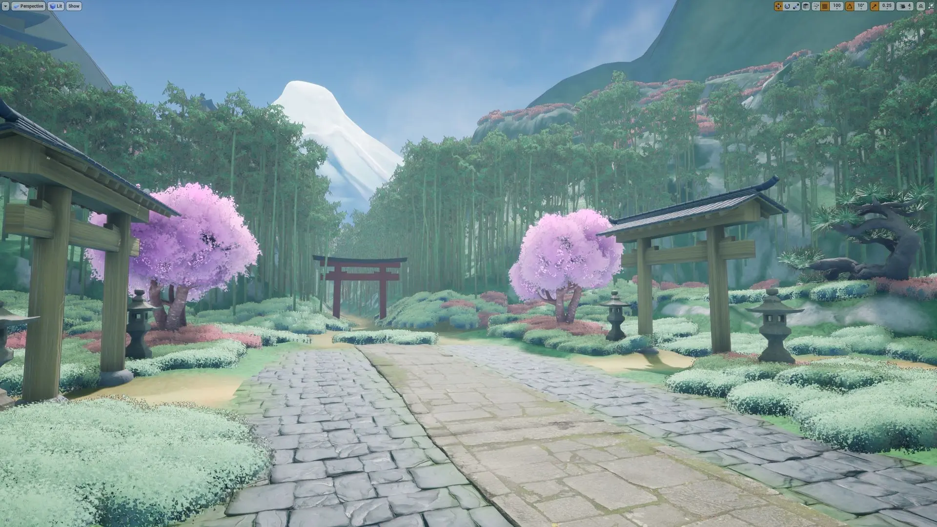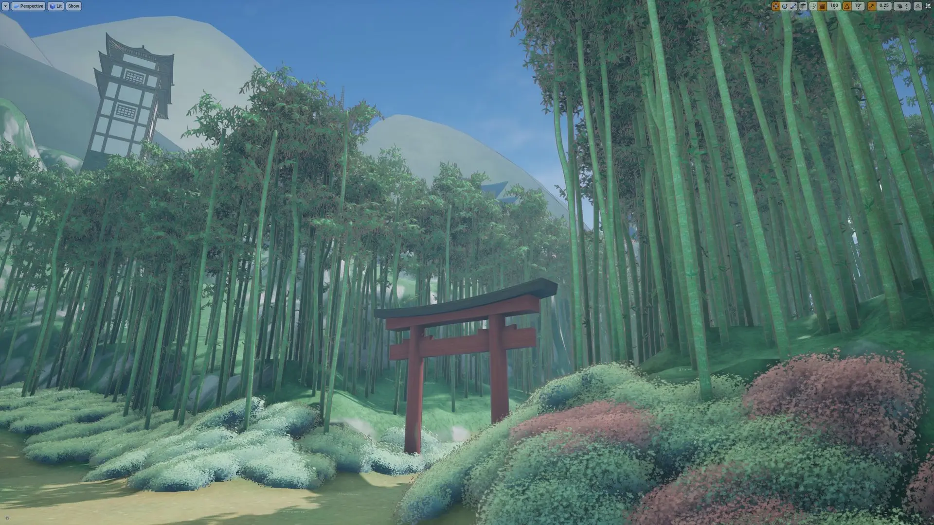 The landscape material properties (color, roughness, specular, normal, etc) are ultimately set by a Runtime Virtual Texture (RVT), offsetting the cost of shader calculations. I think this is critical for maximizing the potential for a painted feeling, while being optimized. For example, with this method, we can have as many landscape paint layers for color variations as we want without increasing runtime rendering costs. This lets me treat the landscape more like a canvas for paint strokes, rather than an accumulation of only a handful of materials.